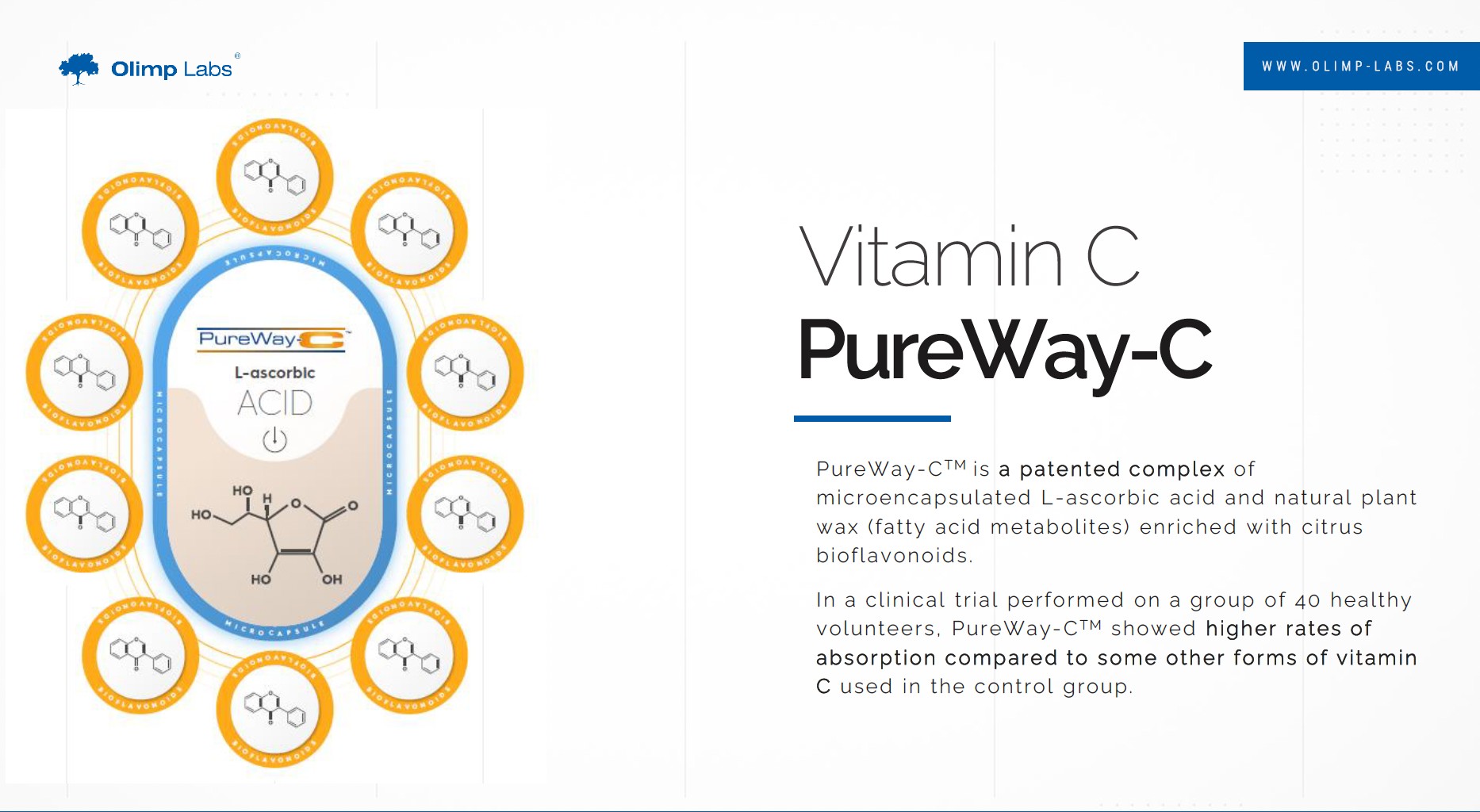 PureWay-C™ เป็นรูปแบบเฉพาะของวิตามินซีที่มีคุณสมบัติการดูดซึมได้ดีกว่าวิตามินซีทั่วไป ด้วยเทคโนโลยีการบรรจุวิตามินซีรวมกับ Fatty Acid ทำให้วิตามินซีเกิดการฟอร์มตัวในรูปแบบ VitaminC-Fatty metabolites ซึ่งโดยธรรมชาติของเซลล์ในร่างกายจะคุ้นเคยกับ กรดไขมัน (Fatty Acid) และอนุญาติให้เข้าสู่เซลล์ได้ดีกว่าวิตามินซีโดยลำพัง นอกจากนี้กระบวนการผลิต PureWay-C ยังมาพร้อมกับ Citrus Bioflavonoids ที่ช่วยลดการเกิดการ Oxidation ของวิตามินซีในร่างกาย ทำให้วิตามินซีมีประสิทธิภาพสูงสุด ดังนั้นรูปแบบของวิตามินซีที่ฟอร์มตัวรวมกับ Fatty Acid ลิขสิทธิ์เฉพาะของ PureWay-C™ นอกจากจะดูดซึมผ่านระบบทางเดินอาหารเข้าสู่กระแสเลือดได้มีประสิทธิภาพกว่าวิตามินซีทั่วไป ไม่เกิดการระคายเคือง ระบบทางเดินอาหาร ยังดูดซึมเข้าสู่เซลล์และออกฤทธิ์ได้ดีโดยไม่ต้องทานปริมาณสูง